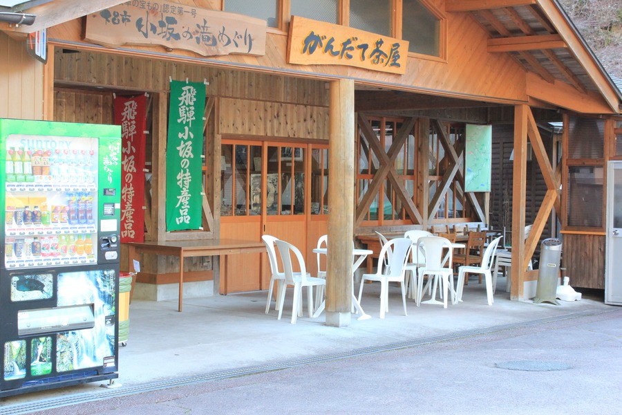 下呂市小坂町の厳立峡。滝や巨木が見受けられる大自然の中に、粛々と佇む休憩処「がんだて茶屋」。