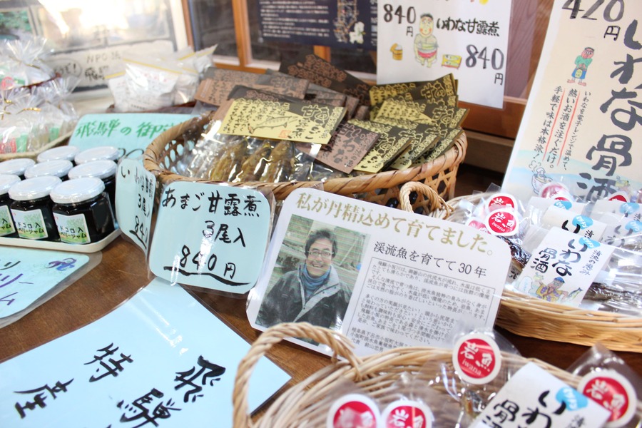 飛騨小坂の特産品を取り揃えている店内には、採れたての山菜からアマゴの特産品まで