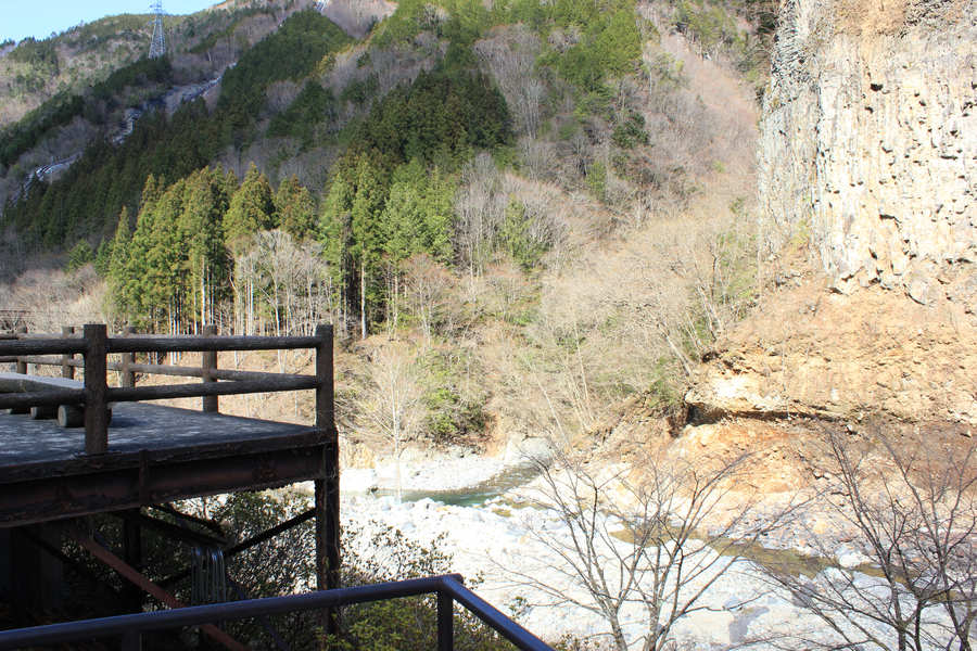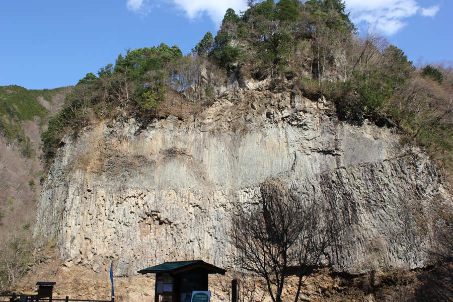 県指定天然記念物「巌立峡(がんだてきょう)」の対岸に位置する絶景地。高さ72メートル・幅120メートルの大岩壁は、5万4000年前の御嶽の大噴火で形成されたといわれ、溶岩流の断面としては日本一の大きさを誇る。